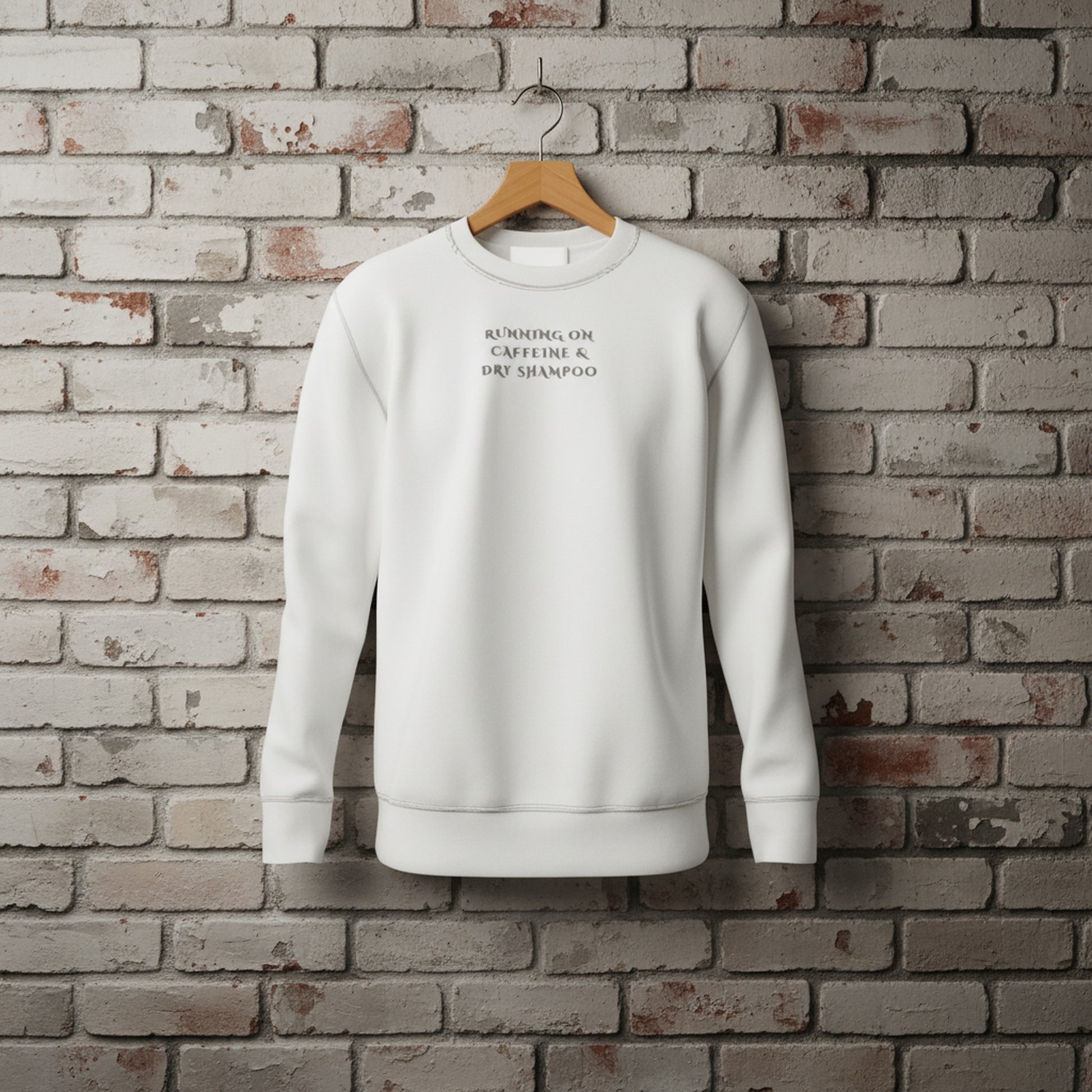 Stay stylishly comfy while embracing your daily essentials with our Running On Caffeine & Dry Shampoo sweatshirt. Perfect for busy days or lounging at home. The trendy design makes it a great gift for coffee lovers and busy moms alike. It's a must-have addition to your wardrobe.