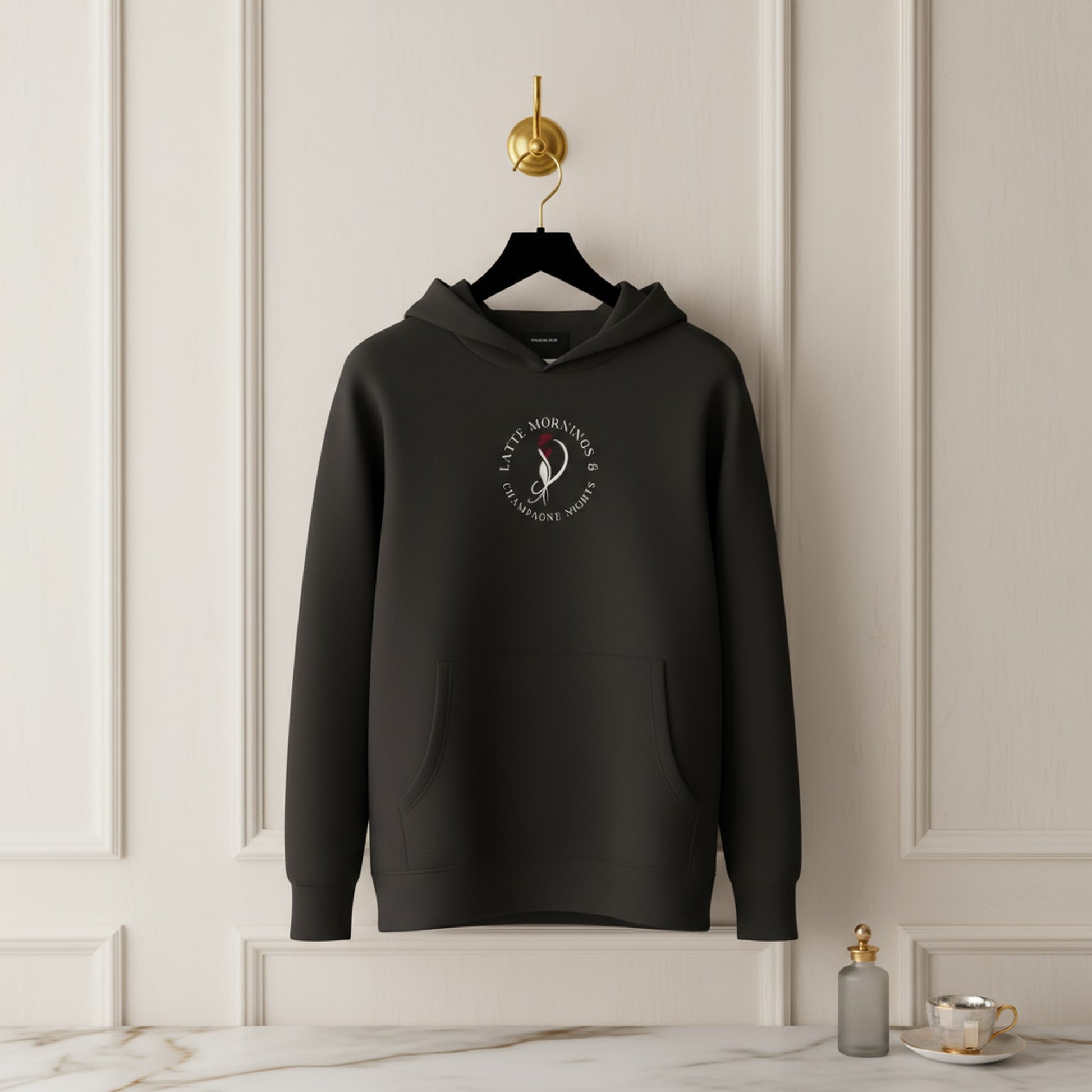 Chic Black Hoodie: Latte Mornings Champagne Nights Design