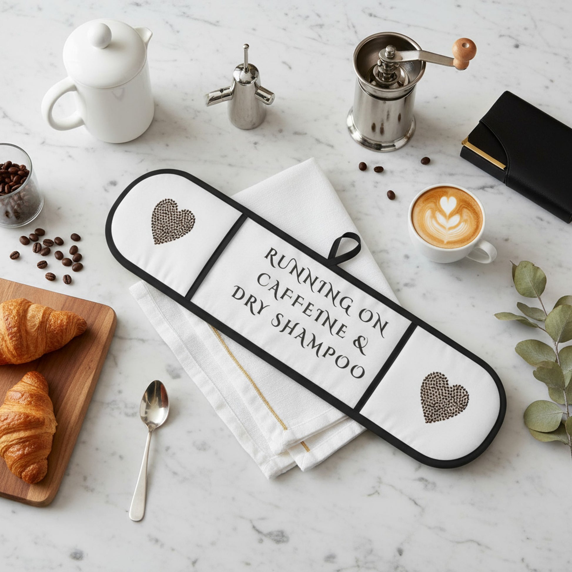 Elevate your kitchen style with our Running on Caffeine & Dry Shampoo oven gloves. Perfect for coffee lovers and busy individuals, these heat-resistant gloves are not only functional but also bring a touch of humour to your cooking routine. A fantastic gift for friends or a fun addition to your own kitchen.