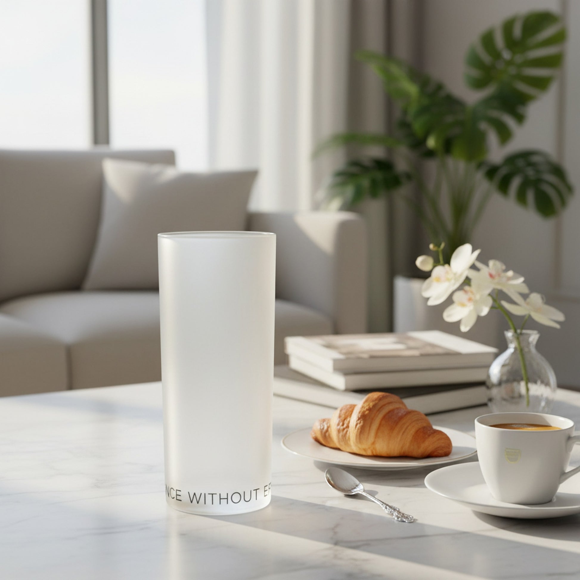 · Straight sided, tall glass ·Holds 290ml ·16.5cm tall, 6cm wide 2cm thick bottom · Matte frosted finish · Made to order · Sustainably made in the UK · Dish wash on low temp below 30°C or wash by hand